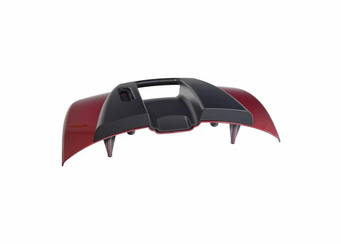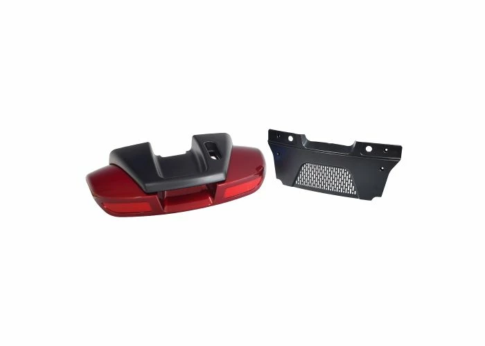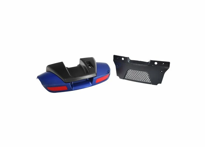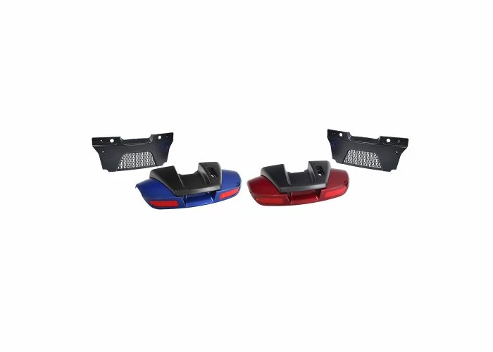 There’s a lot of stuff here. We send you your choice of a high-gloss blue or red shroud with reflectors, the black rear cover with handle, the black bumper/grill, and all the necessary hardware, and you get this whole assembly at one low Monster Scooter Parts price.